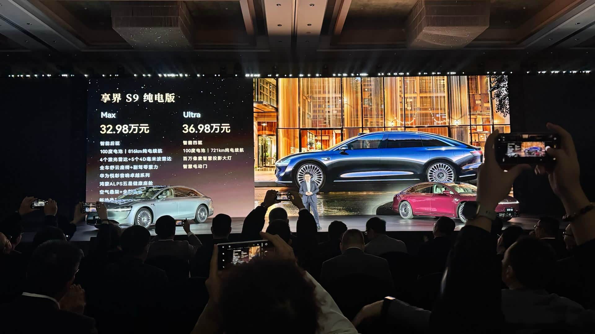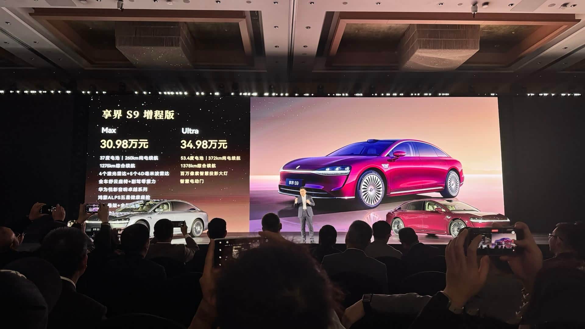 新款享界S9 三厢版价格出炉,纯电 max 32.98 万,ultra 36.98 万,增程 max30.98 万,ultra 34.98 万。 享界 S9 拥有 6 项鸿蒙 9 系专属配置,包括满配 ADS4、25 扬音响、maglink 控制屏、支持隔空开门的电动门、智慧投影大灯、顶配的静谧座舱。 外观变化的精髓主要在灯,前灯和尾灯都和 S9T 对齐了,星河的元素现场看很精致。 图二 隐藏水切+电子外后视镜,这个角度有点精致