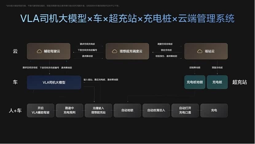 上次聊理想 VLA 充电功能,也展示了充电机器人。这次广州车展上,他们开始卷「自主充电路线」了。 发布会上,理想汽车产品部高级副总裁范皓宇介绍,理想VLA司机大模型经强化学习持续进阶,凭强大空间理解能力优化泊车与充电体验,全新VLA充电功能可让车辆自主驶入、驶出超充站,打通充电“最后100米”,也是车、桩、站、云体系化能力的集中体现,防御性AES还能实现360度全方向安全守护。 车辆接近超充站后,可自动匹配空闲充电桩,地锁自动降下,自主泊入、充电全程无需人工操作,充完自动驶离并完成免密支付,彻底解放用户双手。目前VLA司机大模型累计行驶超3.12亿公里,日活提升3倍,空间理解与路线规划能力经充分实测验证。 理想延续高效覆盖优势,宣布2026年1月该功能将覆盖1400多座超充站,3月目标达2900座。当下L系列销量遇挑战,纯电i系列需扛起销量大旗,这套高速补能网络能否成为理想新护城河备受关注。#新能源大牛说# #理想VLA司机让充电更自由# #理想VLA打通充电的最后一百米#