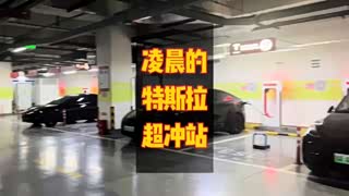 凌晨的特斯拉超冲站,三辆特斯拉在充电