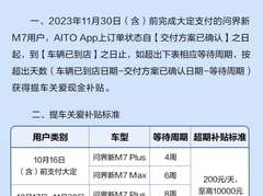 超时提车可领钱?问界新M7发布提车延迟补贴:至高补贴1万元