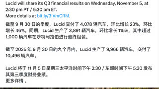 Lucid三季度交付4078辆车,同比增长46% 交付环比增长23%,同比增长46% 生产方面,3季度生产了3891辆新车,同比增长115% 并且其中有超过1000辆是在沙特阿拉伯组装的(这里说一下,沙特主权基金PIF已经是Lucid绝对的大股东了,已经砸了超过60多亿美元,股份占比超过60%,有点可惜的是当时沙特对高合也感兴趣的,当时有个56亿美元的合作意向,但沙特最终持续把钱给了Lucid,要是分给高合20亿美元,今天高合应该还不错) 算是开始好起来了 主要是其SUV Gravity开始交付了 这车可以理解为美国版的乐道L90 1-9月来看,共生产了9966辆新车 交付了10496辆新车 这个量还是太少了,只能说美国的生产效率和国内不能比
