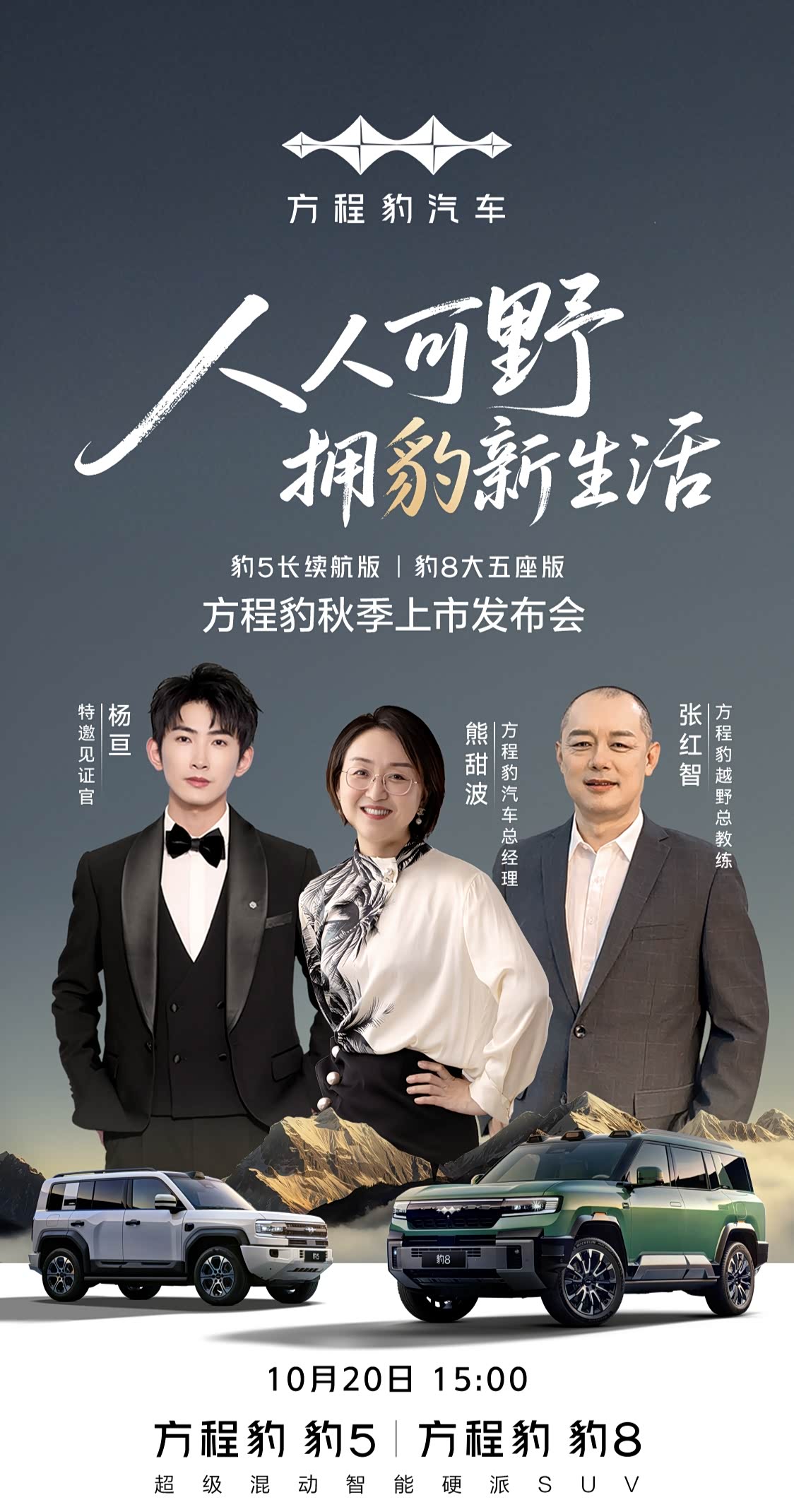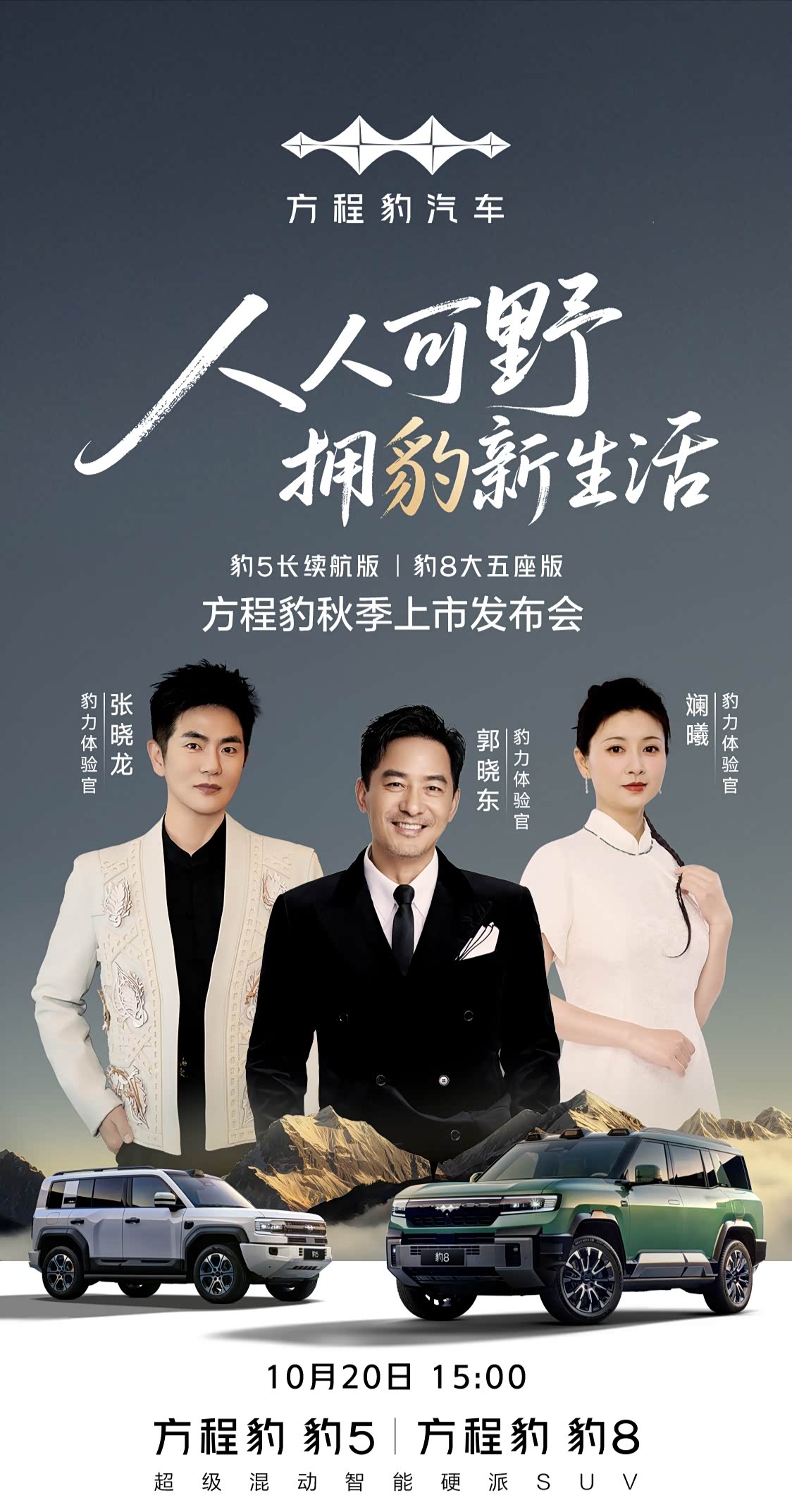 方程豹秋季上市发布会定档 10 月 20 日 15 时,届时将推出豹 5 长续航版、豹 8 大五座版两款新增车型,其中豹 5 长续航版纯电续航有望突破200公里。