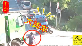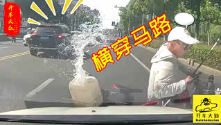 横穿马路大作战,司机翻滚车碎烂!