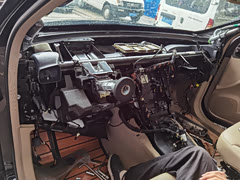 奔驰R300 更换空调蒸发箱 故障的现象是,车里能闻到浓浓的消毒水味道,然后伴随着空调制冷效果的变差。 经过修理厂有经验师傅预判,基本就是蒸发箱漏了,这个也算是奔驰R级的通病 当然,换蒸发箱是一个特别大的工程,需要把整个中控台以及扶手箱都拆掉,才能更换。 图5,是坏了的老蒸发箱,手指处漏了,有浓浓的消毒水味道。 图6,是受到冷媒污染的风道。 图7,是新的蒸发箱配件,ACM的品牌 图8,是新的蒸发箱安装后的样子