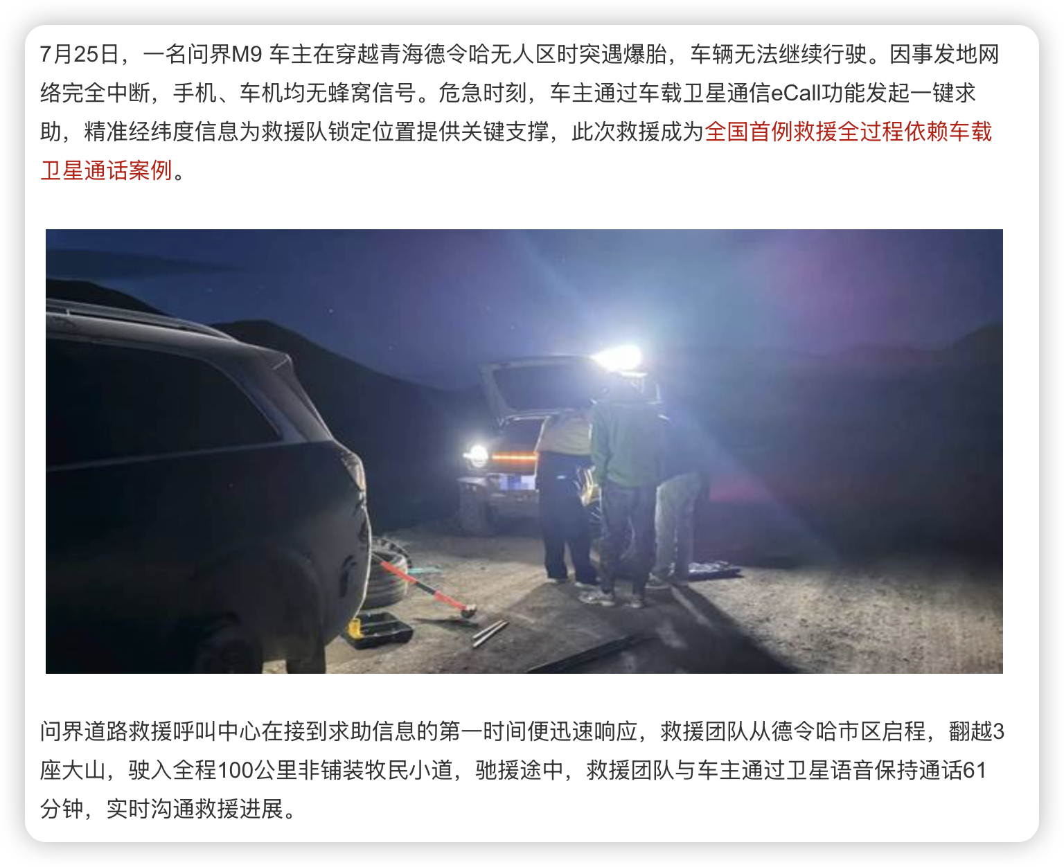 7月25日,青海德令哈无人区,一辆问界M9因爆胎被困海拔4000米的高原戈壁。手机无信号、车机失联、夜幕降临、气温骤降……车主命悬一线时,问界M9的车载卫星通信eCall功能一键触发,成为“生命热线”! 🛰️ 卫星通信如何“逆天改命”? 1️⃣ 无网之境,精准定位 车主通过卫星直连问界救援中心,经纬度信息秒级同步,救援队5分钟锁定位置,打破无人区“失联魔咒”。 2️⃣ 离车30米仍能通话 华为星河通信技术加持,车主检查车辆时仍可用手机卫星通话,61分钟持续沟通,救援进展实时掌握。 3️⃣ 360°搜星,翻滚不失联 问界M9首创主天线+双补盲天线设计,即使车辆侧翻、仰翻,卫星信号仍稳定连接,极端姿态下ECALL功能永不“掉线”。#智享车生活