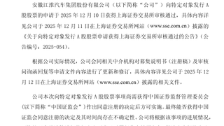#汽车资讯# #汽车# 【#江淮汽车# :向特定对象发行A股股票申请文件更新待注册】 江淮汽车公告称,公司向特定对象发行A股股票申请于2025年12月10日获上交所审核通过。现会同中介机构对募集说明书(注册稿)及审核问询函回复等申请文件进行更新修订。该事项尚需获中国证监会同意注册决定方可实施,最终能否获批及时间不确定,公司将依规披露进展,提醒投资者注意风险。
