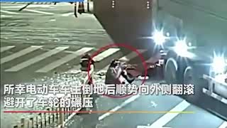 电动车与大货车相撞被碾粉碎,骑车人一个翻滚死里逃生