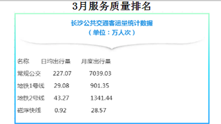 近日,长沙市道路运输管理处公布3月份长沙公共客运行业服务质量排名。 3月公共汽车行业服务质量综合考核平均得分为98.54分,上升0.51分。得分最高的是龙骧巴士公司,最低的是湖南巴士公司。 出租汽车行业服务质量综合考核平均得分为86.19分,下降0.25分。得分最高的是市出租汽车公司,最低的是通畅公司。 3月份,轨道交通运营单位得分为91.16分,长沙地铁2号线得分为93.59分,长沙地铁1号线得分为93.46分。