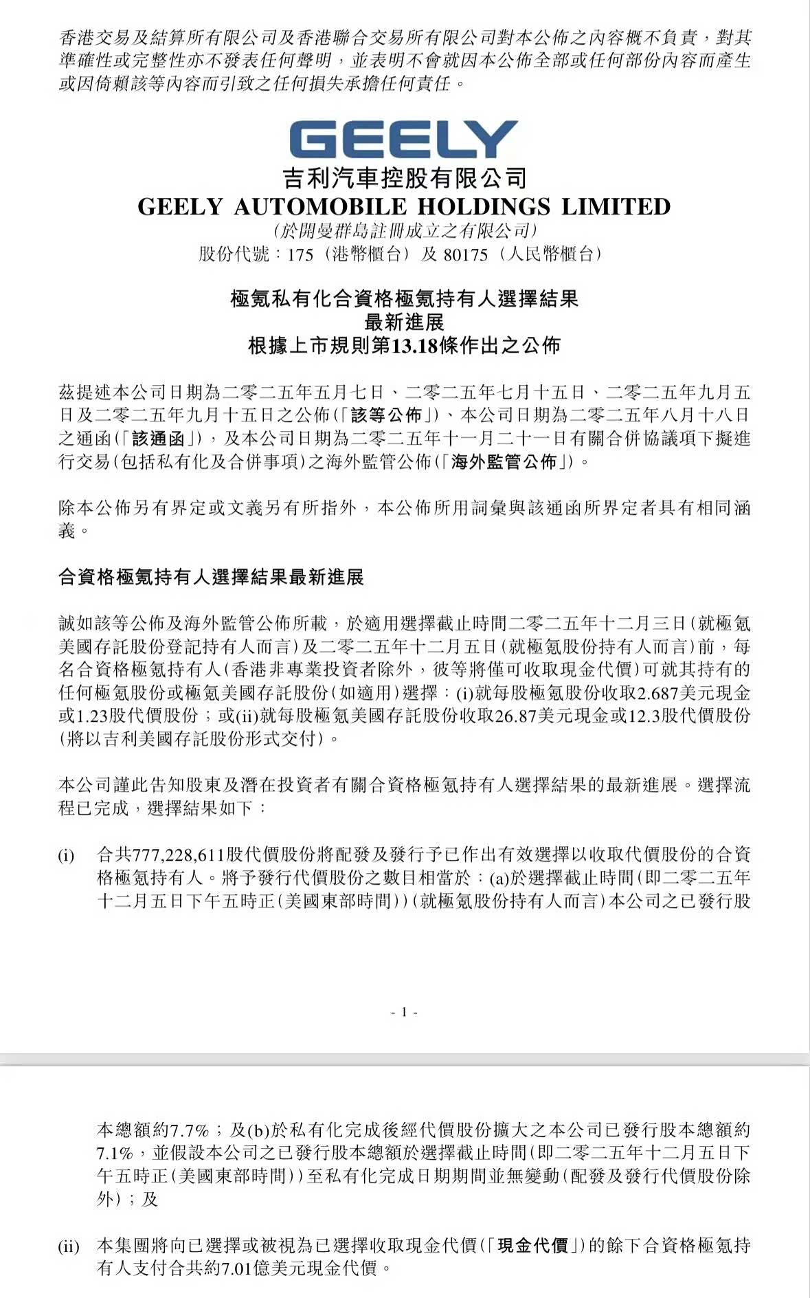 12月9日,吉利汽车控股有限公司(0175.HK)发布公告,正式披露极氪智能科技控股有限公司(NYSE:ZK)私有化交易的持有人对价选择结果。这一关键进展标志着吉利“回归一个吉利”战略进入收官阶段,集团资源整合即将完成最终闭环。 根据公告,在极氪私有化的对价选择中,约70.8%的合资格极氪持有人选择股份对价,吉利汽车将为此配发及发行共计777,228,611股对价股份;另有约29.2%的合资格持有人选择或被视为选择现金对价,对应现金支付总额约7.01亿美元。双对价方案既满足了不同持有人的流动性需求,也体现了市场对整合后吉利汽车长期价值的认可。 作为吉利“回归一个吉利”战略的核心落子,此次私有化交易并非孤立动作,而是集团长期资源整合的必然结果。按照规划,吉利汽车与极氪的合并交易将于2025年12月29日或之前正式完成。合并完成后,吉利汽车将实现多重战略升级。品牌层面,将形成极氪(豪华)、领克(高端)、吉利银河(主流新能源)、中国星(节能燃油)的差异化矩阵,全面覆盖主流、中高端与豪华三大细分市场。动力领域,吉利也将构建“燃油+纯电+插混+醇氢电动”的多元体系,形成技术协同优势。