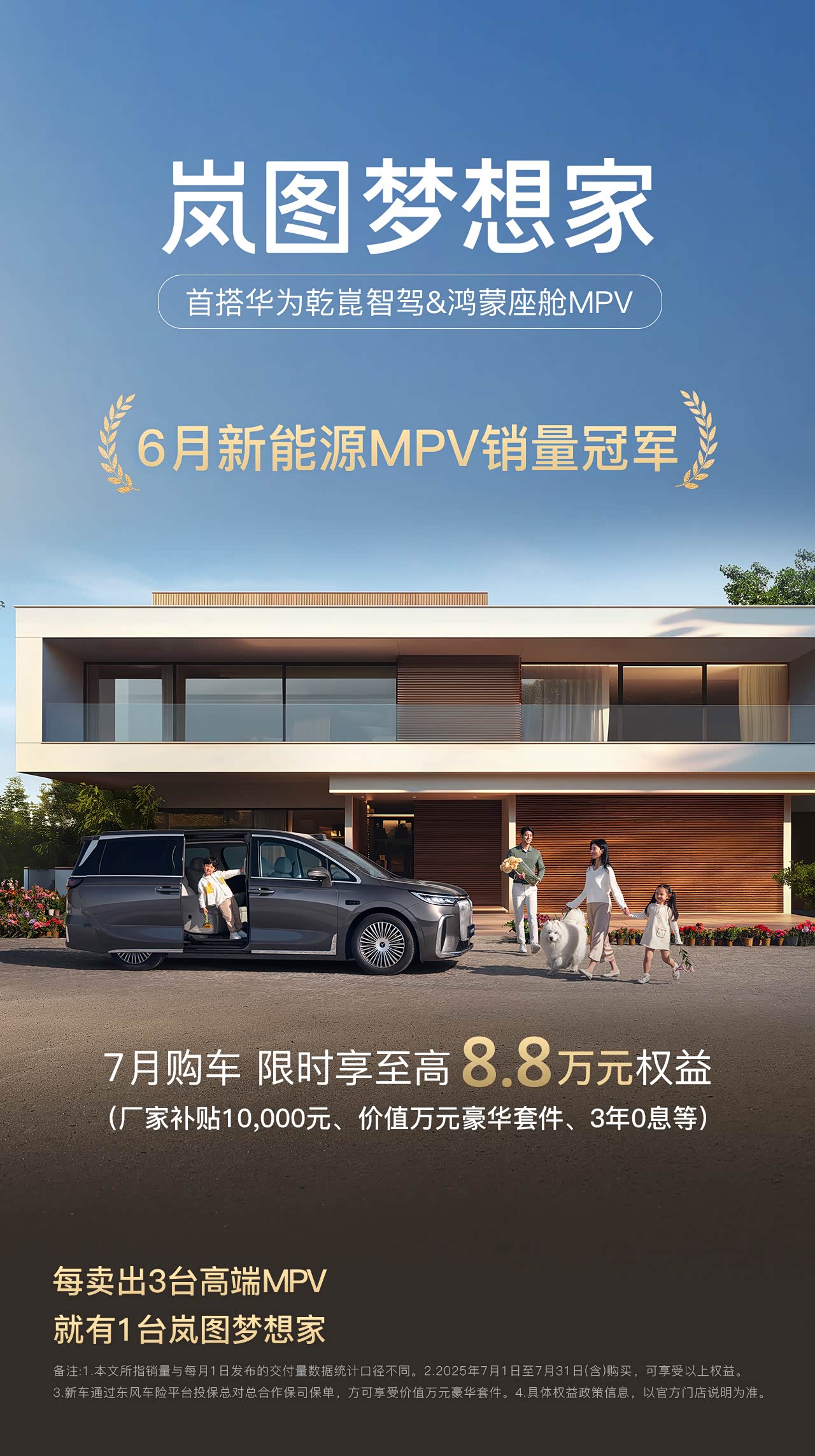 近日,岚图汽车公布岚图梦想家6月销量数据,全新岚图梦想家以8300台成为新能源MPV市场销冠,同时实现了月销量四连涨。凭借在智能、舒适、安全等方面的巨大优势,岚图梦想家在高端消费市场备受欢迎,累计销量已突破10万辆。在35万以上高端MPV市场,每卖出3台就有1台是岚图梦想家。 作为岚图品牌的首款“爆款”车型,岚图梦想家持续精进,首款搭载华为乾崑智驾ADS 3.0与鸿蒙座舱4.0,拥有行业第一梯队的智驾能力,同时在智能座舱体验上也大幅领先同级产品。为了给用户带来全维度高品质驾控体验,岚图梦想家搭载同级唯一的魔毯空气悬架与CDC减振,配合前双叉臂+后五连杆的悬挂结构,代表了高端MPV驾控的最高水准。为了守护用户安全,岚图梦想家采用2000MPa超高强度笼式车身设计,还有21项高阶主动安全功能加持,主被动安全得到了各大权威测试机构一致认可,能够给用户带来无与伦比的安全感。 7月12日,岚图大五座旗舰SUV——岚图FREE+将在岚图用户之夜正式上市,届时岚图梦想家将与岚图FREE+组成“双爆款组合”,彻底打通品类壁垒,为更多高端用户提供多元化购车选择。