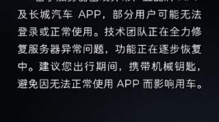 长城汽车多个APP故障无法开门,官方回应:逐步恢复中 今日,不少车主反映,长城汽车旗下多个App出现故障,蓝牙钥匙车主无法开门。 对此,长城汽车发布《服务器异常公告》称,由于服务器出现异常,五品牌 APP及长城汽车 APP,部分用户可能无法登录或正常使用。技术团队正在全力修复服务器异常问题,功能正在逐步恢复中。长城汽车还建议车主出行期间携带机械钥匙避免因无法正常使用 APP 而影响用车。