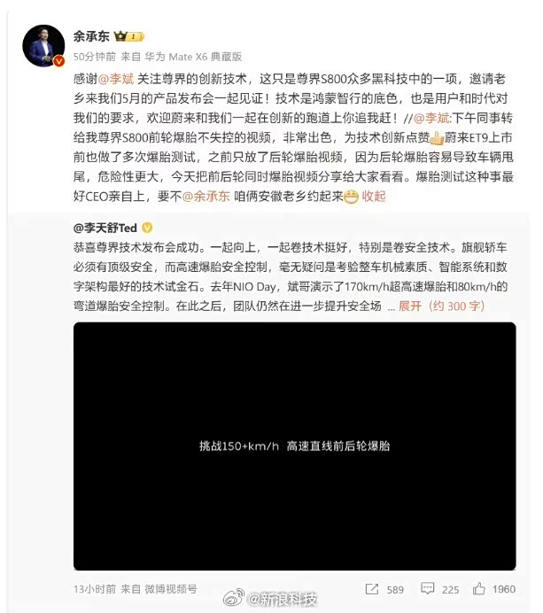 余承东回应李斌喊话 华为常务董事、终端 BG 董事长、智能汽车解决方案 BU 董事长余承东今日在微博发文:“感谢李斌关注尊界的创新技术,这只是尊界 S800 众多黑科技中的一项,邀请老乡来我们 5 月的产品发布会一起见证!技术是鸿蒙智行的底色,也是用户和时代对我们的要求,欢迎蔚来和我们一起在创新的跑道上你追我赶!” 昨日,蔚来产品副总裁李天舒分享了 ET9 轿车“挑战 150+km/h 高速直线前后轮爆胎”视频,蔚来创始人、董事长、CEO 李斌转发了该视频,表示爆胎测试这种事最好 CEO 亲自上,并喊话华为余承东一起测试。(新浪科技)
