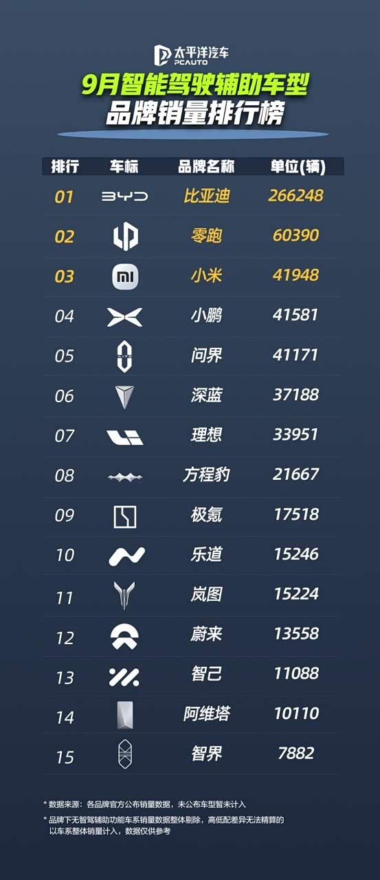 比亚迪1-9月销量超326万稳居榜首,这成绩确实很亮眼,金九银十,比亚迪9月销39.6万辆,同比增18.6%,前三季度累销326万辆,完成全年71%。王朝海洋35.6万辆,稳居品牌第一;“天神之眼”智驾车型累销破170万辆,9月占比91.3%,日跑1亿公里数据。 在海外市场同样很亮眼,9月,比亚迪乘用车及皮卡海外销量达70,851辆,同比增长107%,1–9月累计出口超70万辆,占集团总销量的22%。 比亚迪现在真的是全维度领跑市场,不仅国内还领跑全球新能源#比亚迪##比亚迪[超话]##新能源#