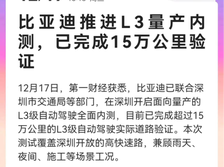 比亚迪全面推进L3级自动驾驶量产内测 已完成15万公里验证