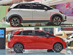 本田第四代飞度它“呆萌呆萌”的就跑来了,6月10日刚刚亮相的第四代飞度,今天我们就拍到了,唯一不足的是,目前只能拍摄外观。此次拍摄有CROSSTAR版(潮越Max)和SPORT 版(潮跑Pro)。笔者用7张对比图方式标注了外观区别,不同点如下:1、前杠外形不同(其中包含中网、雾灯、下唇)其实就是换了个前杠造型。2、侧轮眉不同(前后轮眉和下装饰条)其实就是加装了一套塑料护板。3、轮毂和轮胎不同;4、后杠外形不同,和前杠一样就是换了一个杠皮;5、车顶不同(潮越Max是安装行李架,潮跑Pro安装尾翼)其实都是部件可以相互替换。6、悬挂结构相同但是高度不同(潮越Max底盘比潮跑Pro高一点)。其余动力配置相同,搭载Honda“地球梦科技”动力——1.5L直喷DOHC i-VTEC发动机+M-CVT变速箱。预计第三季度会发布上市。 笔者总结:虽然有2个不同外形版本,但只要部件并没有差异化,只是前后杠皮和一些装饰件的区别,两车零件基本可以互换。笔者比较在乎的是,两个不同版本车型的动力、底盘调校是否也保持一致?笔者也会持续关注,如果您对这个萌萌的小家伙感兴趣,可留言探讨。