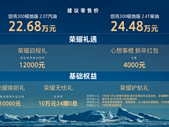 12月11日,坦克300极地版正式上市,售价为22.68万元-24.48万元。新车在普通版的基础上采用专属拉花,并搭载多项升级装备,进一步兼顾冰雪场景。该车限定300辆销售,本月下旬正式开启交付。外观层面,坦克300极地版会以“极地橙”为底色,增加“极地荣耀徽章”以及“极地锋芒”拉花,整车的辨识度还是很高的。值得一提的是,之所以用橙色为主色调,是因为该颜色是国际救援的安全色。在车内,极地版的座椅头枕上烫印了南极版图与长城站的经纬坐标。配置方面,坦克300极地版有几项专属升级。该车配备支持远程控制开启的前风挡加热功能、支持自动开启的雨刮喷嘴加热功能、原厂AT全地形轮胎(265/65 R17)、9500磅无线遥控绞盘、2.5吨牵引资质。动力系统部分,坦克300极地版会有柴油版和汽油版。柴油版搭载2.4T柴油发动机,最大功率为137kW(186马力),峰值扭矩为490N·m;汽油版搭载2.0T汽油发动机,最大功率为167kW(227马力),峰值扭矩为387N·m;传动系统部分,该车使用9速手自一体变速箱,匹配电控分时四驱(带中央锁止功能)。