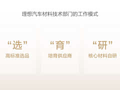 12月9日理想汽车材料技术日,在材料技术上学习与胖东来类似的“选、育、研”思路。例如,理想i8与i6的座椅选用的LWG金牌认证Nappa真皮,搭配超低染料环保技术与天然植物胶,从源头减少有害物质释放,同时整车配备低醛PU表皮、低散发海绵等材料。理想还与供应商深度共创,像与诺贝丽斯联合开发LeS6 Ultra铝合金,该材料屈服强度为传统铝合金的3倍,已用于理想i6的电池底护板,可有效提升抗穿刺能力。而理想甚至深度自研材料学,针对高压油箱的不足开发了UFHS-X不锈钢材料,其屈服强度和抗穿刺能力比传统304L不锈钢提升100%和52%。此外,还研发出高强韧2000IH热成形钢等材料,通过材料技术强化产品底层支撑。