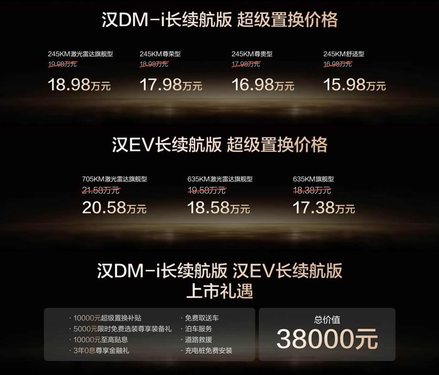 比亚迪汉加推长续航版,昨天转了一个通稿,今天跟大家聊聊重点。 这一次汉的长续航版,我的感觉是从根源上解决了用户之前的里程焦虑。其中DM-i版车型的纯电里程达到了245公里,对于城市上班族而言,这个纯电里程甚至可能够一周的通勤了,也就只有在跑长途的时候才用得上油,此时又可以享受第五代DM技术极高的燃油经济性。而纯电EV版汉加推的则是635公里和705公里的款型,电耗也升级到了10.6度百公里,无论是城市通勤,还是偶尔的长途跋涉也足够应对了。 如今的汉,不愧是保有量破百万的成熟可靠车型!这一次的加推更加是动力美学进阶彰显百万实力,大大拓展了车辆使用的舒适区。你会对这样的一款车感兴趣吗?