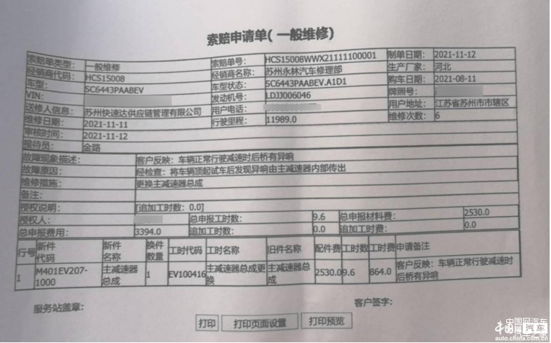 此外,卢先生的车辆还存在后桥异响问题,修了5-6次仍未修好。“异响严重的时候,刹车时车子就像快散架了一样,挺吓人的。前天刚去(修)了,今天又让我去。天天让我去修,又修不好,还耽误赚钱。我这个又是营运车辆,我的生意还要不要做了?”卢先生向记者描述道。