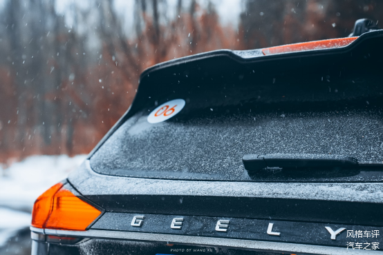 博越X采用双色车身设计,在我们这台黑色的试驾车上并不明显,不过车窗上的镀铬亮条勾勒出的悬浮式车顶为车侧增添几分运动感,同时侧裙上方的橙色亮条和同色卡钳和车头饰条遥相呼应,年轻、张扬的气息一下就勾勒出来了。