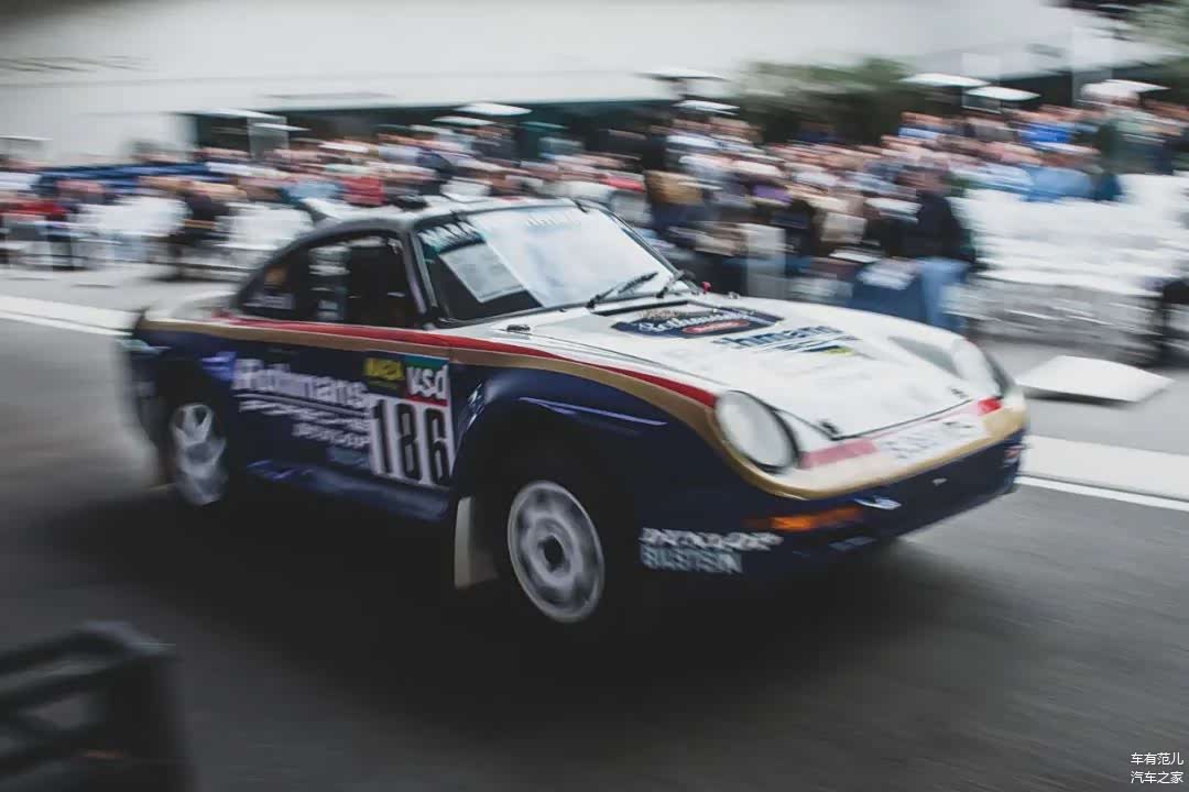 赛车团队将911的底盘升高了27cm,保留3.2L水平对置发动机,并为之加入了一套硬核有效的四驱系统。为了对付多样复杂的赛段,除增大的120L前油箱之外,技术团队又在车内补充了150L的副油箱。这款赛车被保时捷命名为953,为征战艰苦赛程,共打造了3台。