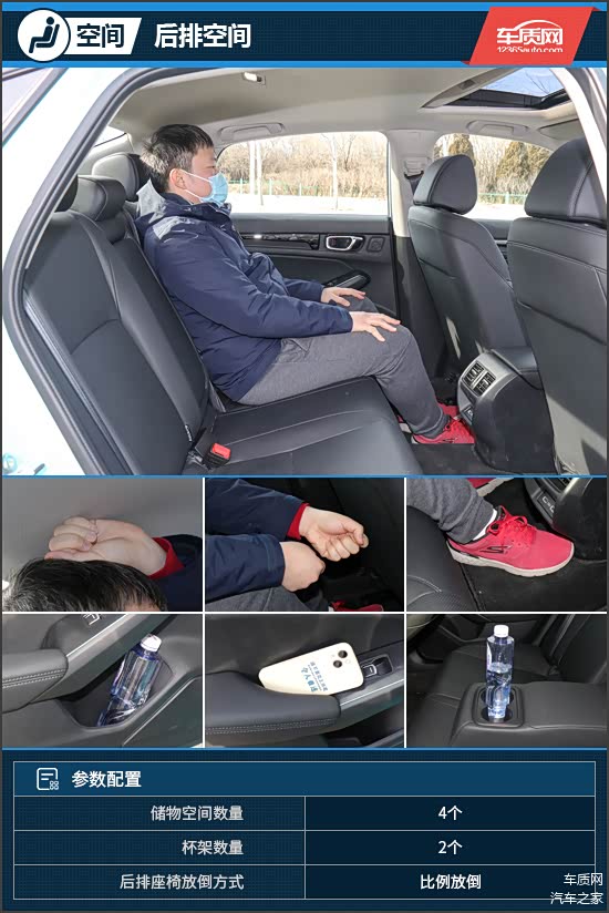 保持前排座椅不变,体验者来到后排,此时头部空间仍有一拳距离,腿部达到两拳有余,地台中央具有一定凸起,对中间乘客舒适性会造成一定影响。储物空间方面,型格整体表现与大多数车型一致,略有遗憾的是,该车并未配备前排座椅后置物袋。