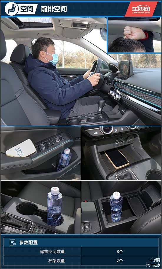 空间方面一直是本田的拿手好戏,因此无需过多担心。170cm身高的体验者进入前排,调整好坐姿后,头部拥有一拳距离。储物方面,前门板储物槽容积表现不错,最前端还设计了专属的水杯架,门把手也采用封底处理。此外,挡把周边的各种储物都十分合理,前方为储物格,右侧为水杯架,后方为中央扶手。