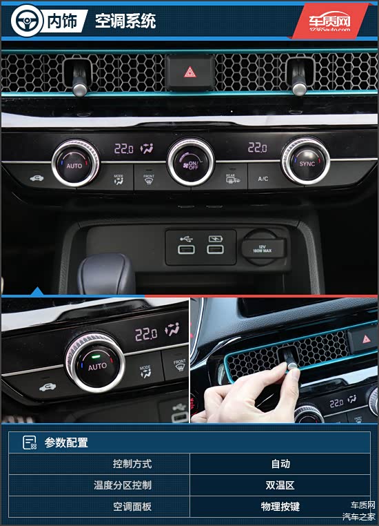 空调区域采用物理按键设计,并且整体造型十分常规,操作起来较为便捷。此外,空调物理旋钮按键以及空调出风口旋钮都很有质感,旋转起来也会有清脆的“咔咔”响声,不禁让人联想到奥迪的按键声音。功能方面,这台试驾车配备自动空调以及PM2.5过滤装置,并采用前排双温区设计,整体表现出色。