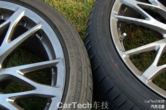 IS-F的轮胎宽度不算夸张,前225 40R19,后255 35R19。应付超过400马力的动力只能算刚刚够用。19寸的轮圈比M3标配的18寸轮圈大一寸,但M3的轮胎规格为245 40R18,后265 40R18。可见IS-F的轮胎宽度相比M3不占优势。轮胎型号为普利司通RE050A,与IS-F的定位很匹配。