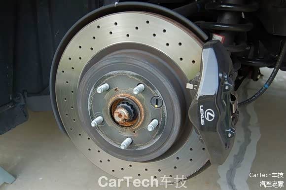 IS-F的前刹车卡钳由brembo代工,值得注意的是这只6活塞大鲍鱼的活塞并未采用等大小的设计,而是设计成大中小三个不同直径的活塞,如此设计能让IS-F的制动力更加线性,脚感更细腻,方便驾驶者对刹车力道的控制。