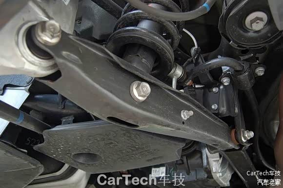 上图为上摆臂与羊角(转向节)的连接点细节,橡胶村套厚度较大,想必是为了不让路感太过于直接,毕竟这还是一台雷克萨斯。上摆臂采用钢质冲压工艺,并未采用铝制构件。