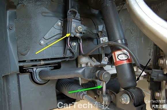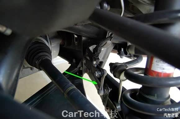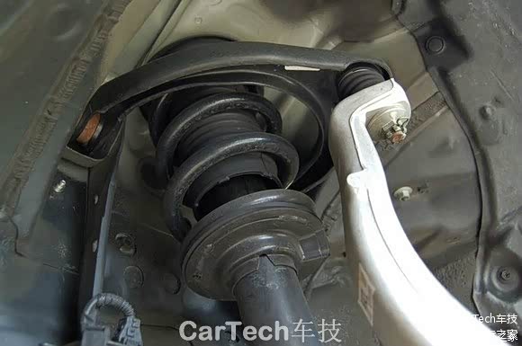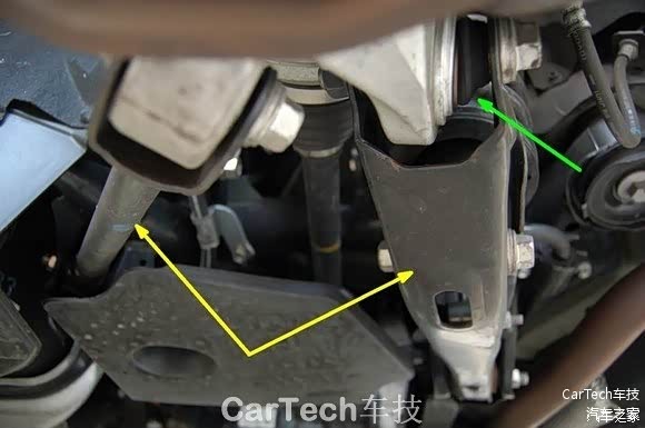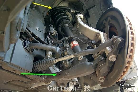 前悬架依然使用和IS相同的双A臂结构,这套悬架在雷克萨斯IS,锐志,皇冠上都能见到。其中上下摆臂均采用钢质结构,仅有羊角采用铝合金制造。(黄箭头为上A臂,绿色为下摆臂)