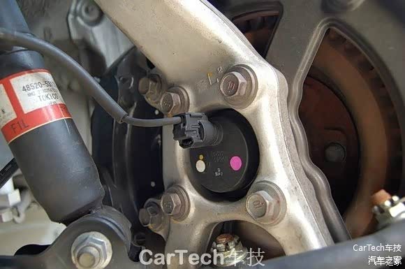 前轮的ABS轮速传感器,四个车轮都拥有一个这样的传感器,因此ECU可以借此判断出车轮抱死/监测打滑以及获取速度信息。