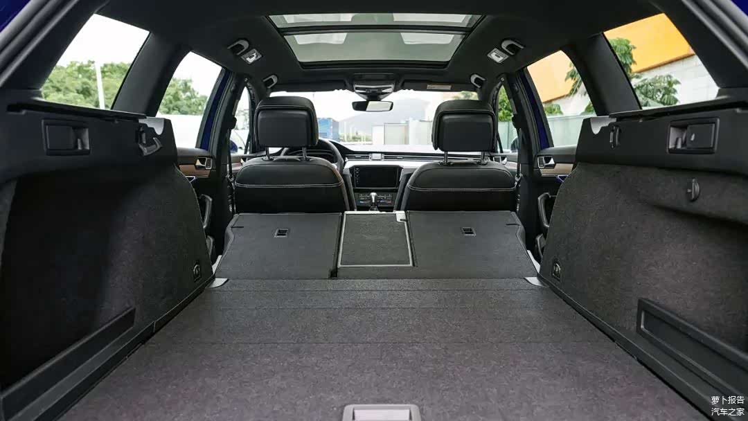 尽管如此,标轴的蔚揽在空间上也是非常宽裕的,并且由于旅行车的平直车顶造型,所以它的后排头部空间反而比国产长轴三厢迈腾更宽敞。至于旅行车后备箱的容积和扩展性优势,就更不用多加赘述了。