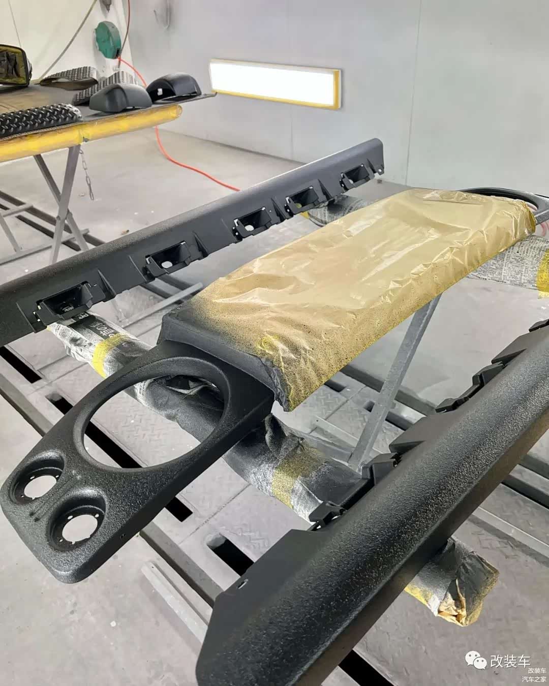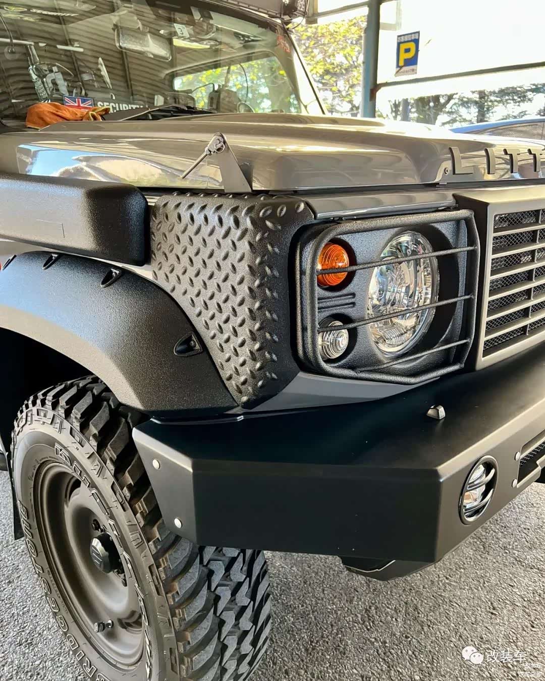 外观为了做得像路虎卫士,横条状的中网和标志性的绿色Logo少不了,还有样式一模一样的防撞前杠,再加两个铁网罩住大灯,小D的前脸就算完工了。