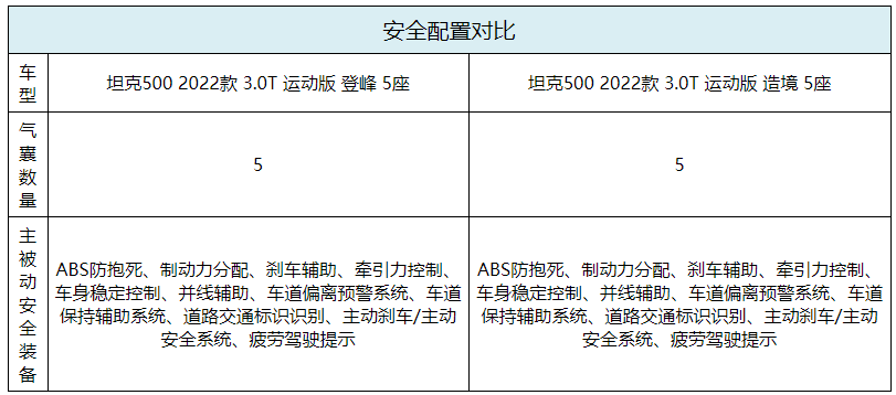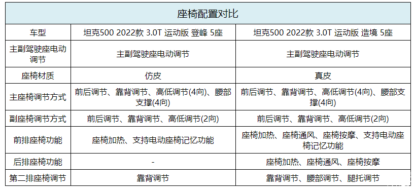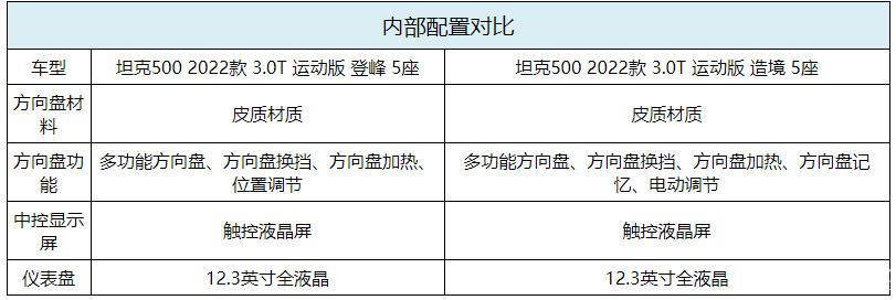 综合来看,坦克500高配、低配车型在配置方面的差距并不算明显,基本上都是舒适性配置的差异,动力总成与四驱系统均完全一致。如果从实用角度出发,选择较低配置的登峰版车型完全够用。