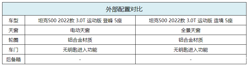 在外部配置方面,坦克500配备了电动天窗、铝合金材质轮圈、无钥匙启动系统、无钥匙进入系统、远程启动功能、车侧脚踏板。相比之下坦克500高配车型多出了全景天窗。
