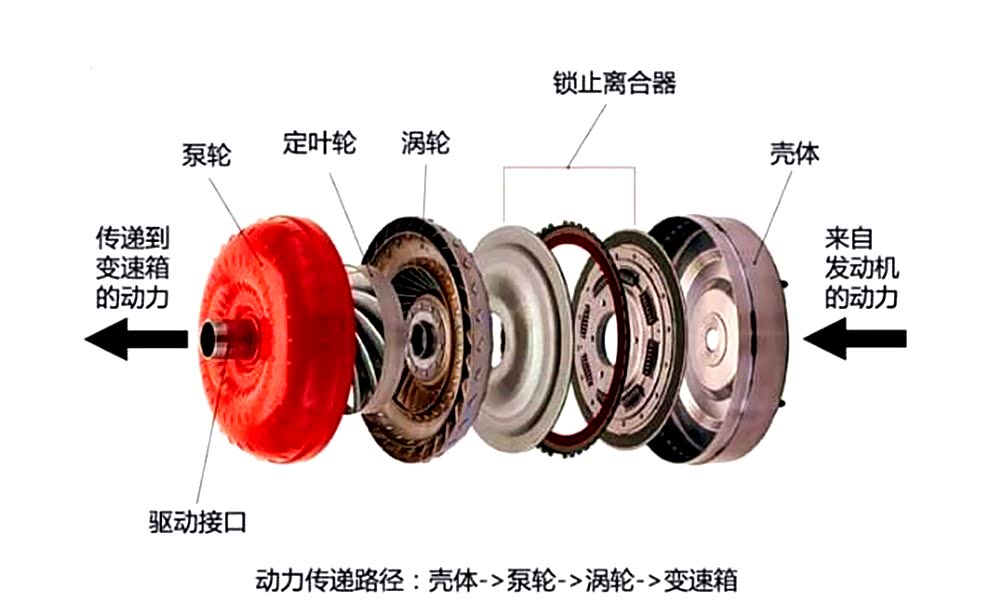 如果大家开过AT变速箱的车就会发现,AT变速箱换挡相对比较柔和。因为AT变速箱内部有液力变速器的机构,液力变矩器的工作原理是发动机动力带动与液力变矩器壳体相连的泵轮旋转,搅动内部液压油,油液在离心作用下向外沿泵轮壳体冲向涡轮,推动涡轮旋转后集中流向轴心位置,油液再流经具疏导作用的导轮,再次回流到泵轮,如此不断往复循环,使动力通过与涡轮连接的输出轴传至齿轮箱。液压油从涡轮流入固走不转的导轮后,方向改变,使其流动方向与泵轮旋转方向一致,增强了泵轮的转动力矩,进而增大输出扭矩,使整个机构具备变矩功能,最大可增加2倍的力矩,所以搭载AT变速箱的车子通常有着不错的起步和爬坡性能。