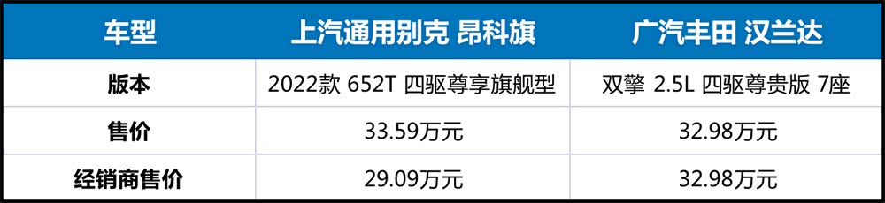 在车型的选择上,别克昂科旗我们选择售价33.59万的652T四驱尊享旗舰型,汉兰达则是售价32.98万元的双擎四驱尊贵版,这也是两款车众多配置车型中售价相对接近的两款车型。结合目前市场终端售价,昂科旗有着较高的优惠力度,而汉兰达则丝毫没有,所以在终端售价上昂科旗有着较大优势。