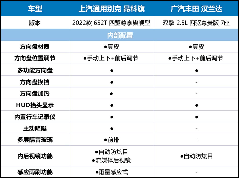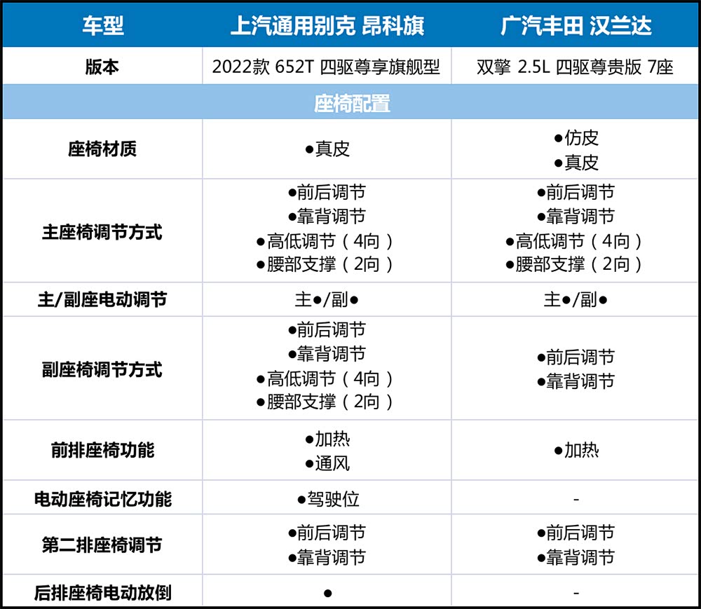 在座椅的配置上,无疑昂科旗也更为厚道,全系都配置了座椅加热和通风功能,Avenir艾维亚版本还配备了后排座椅电动调节和按摩功能,而汉兰达仅在顶配车型上配备前排座椅通风功能。昂科旗还给全系车型都配上了后排座椅电动放倒功能,这项大大提升操作便利性的配置在汉兰达上就别奢望了。