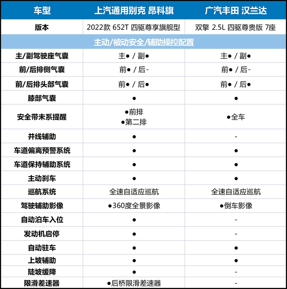 最后在主被动安全配置层面,两台车都配备了包含膝部气囊在内的丰富的气囊配置。昂科旗全系都配备了完善的L2级别驾驶辅助功能,而汉兰达要在中高配车型上才能享受得到,而且昂科旗还比汉兰达多出了并线辅助功能,在汉兰达高配车型上采用的360全景影像,在昂科旗上也是全系标配。