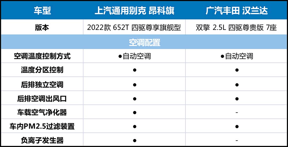 在空调的配置上,两车都全系标配分区独立空调,同样都采用操作便利的实体按键设计,昂科旗全系标配空气净化和负离子发生器,而汉兰达只有在顶配车型上才能享受到这两项配置。
