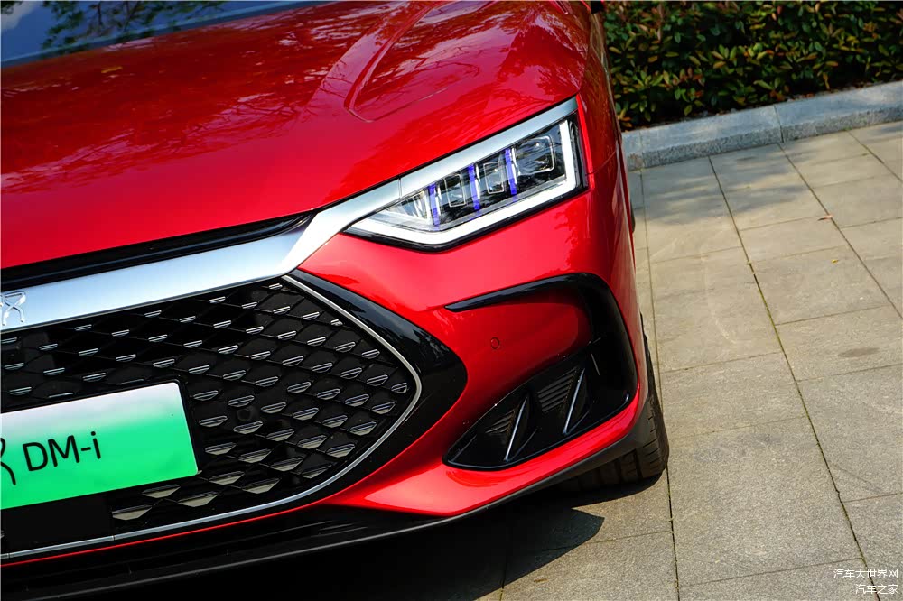 我们这次试驾的是121km的版本,从外观上看和之前的DM车型比起来,整体轮廓造型和设计高度一致,还是比亚迪家族式的Dragon Face设计语言,而DM-i车型对一些细节部分进行了升级,独特的龙鳞进气格栅配合下包围两侧竖起的龙鳞,将整车的运动感大幅提升,而且多边形进气格栅经过重新设计,格栅内部的镀铬元素采用点阵式布局,增加视觉上的美感。