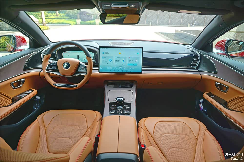 再来看看内饰的“装修设计”,和其他汉系列的产品一样,依旧是中式美学风格,并且在整个内饰的用料和做工上绝不含糊,环抱式的内饰氛围所营造出来的豪华感还是很强烈。中控部分,面对驾驶位的仪表盘采用的是12.3英寸的全液晶屏幕,中控的中心位置安置了一个带旋转功能的15.6英寸大屏,并且已经升级到了Dilink4.0系统,该系统已经拥有最新的UI界面,美观且操作起来更为流畅。副驾驶位的中控面板配备BYD Heart龙擎之心以及无级变色龙鳞副驾面板,整体营造出十足的环抱感氛围与更富高级感的空间层次。