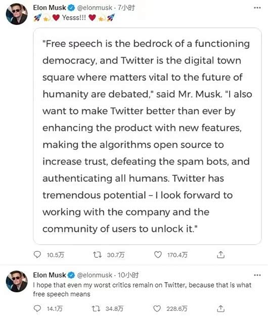 第二件,是向全世界宣告了“新推特时代”的无限畅想,以及昨日刷爆网络的“言论自由是民主运作的基石”。