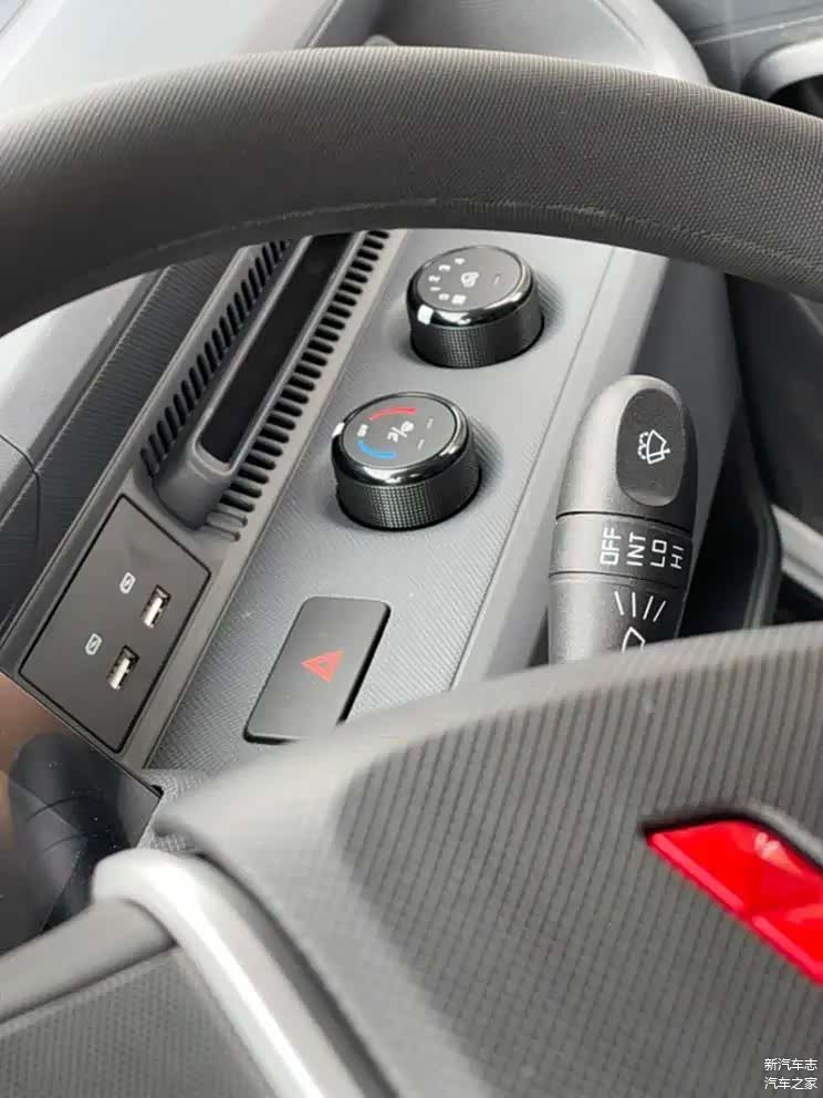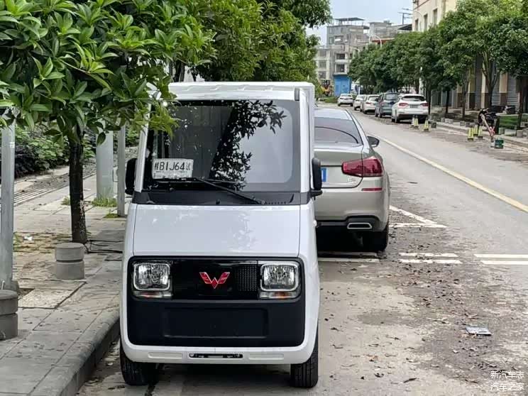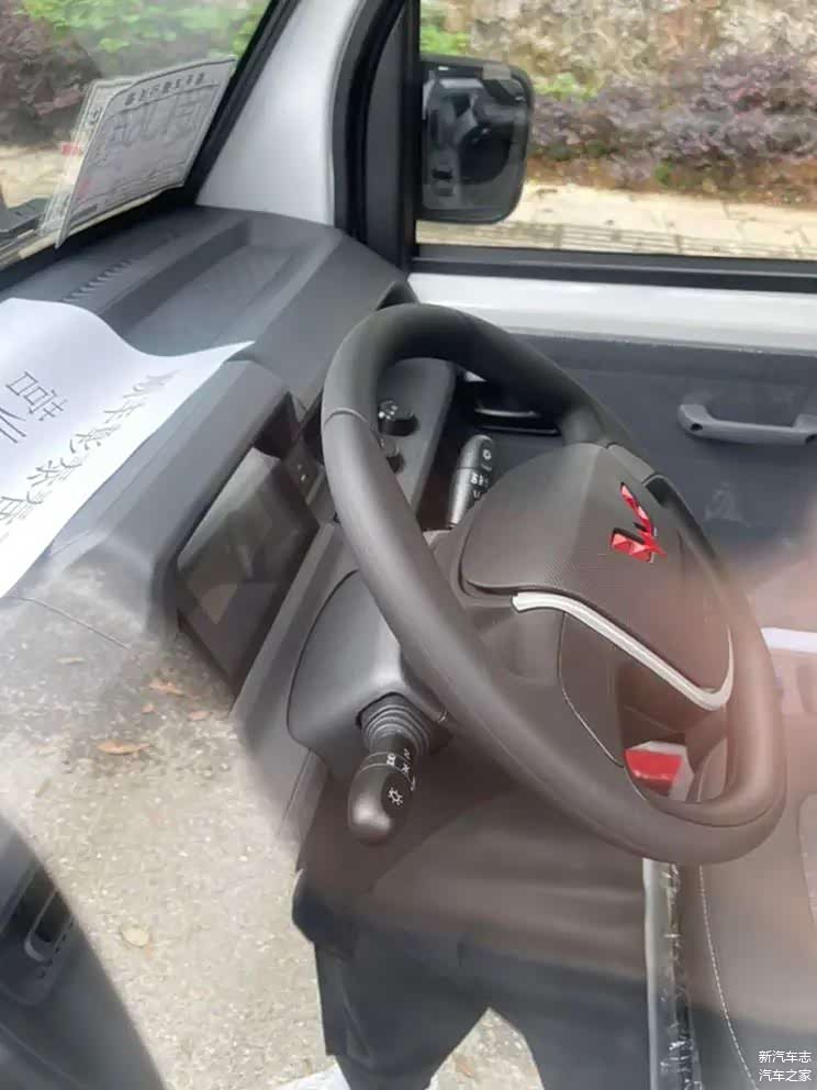 内饰相比起来就很中规中矩了,有着家族式的五菱方向盘,以及数字式的仪表盘,虽然看起来有些简陋,但新车还是带有空调,相比来说,比快递的电三轮要强了不少,毕竟它可以遮风挡雨,而且温度冷热可控了,并且可悬挂正式牌照,可以上路。