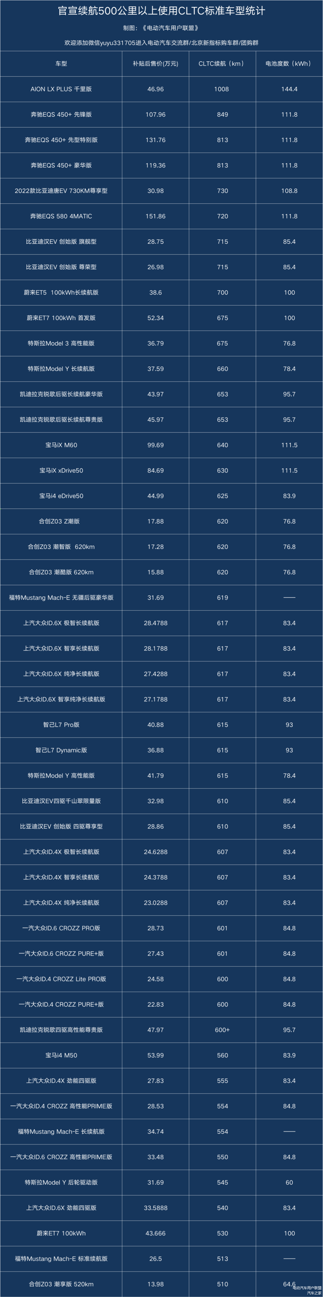 具体可参考此图,《电动汽车用户联盟》统计发现,500公里以上主流续航车型里,至少有51款不同配置车型使用CLTC标准续航了,其中官宣续航700公里以上13款车型里,有9款车型使用此标准。
