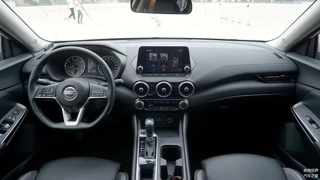日产轩逸的内饰采用大量软性材质包裹,奇怪的是视觉观感还是很强的塑料感。另外,悬浮式中控屏置于展翼式中控台之上,但下方三个炮筒式的空调出风口多少有些“抢镜”,往好的方面说就是层次分明。