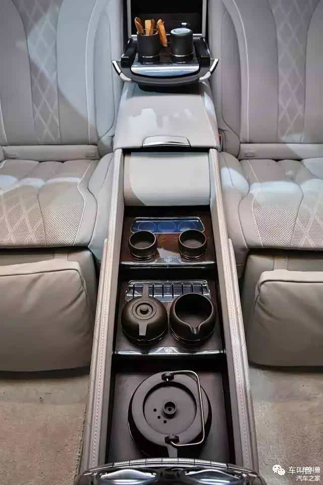 这还不算完,奔驰把后排中央扶手也进行了改装,加入了实木饰板,还放上了几个茶道必备工具。