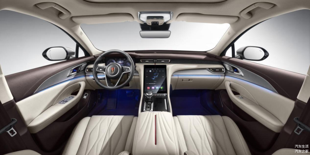 不仅仅是外形,全新红旗H5内饰的进化同样翻天覆地。新车采用和外饰交相呼应的中轴布局,中控台线条由中央的内嵌式屏幕向两侧发散,并与车门面板相连接,形成更加专属的环抱式设计。此外,全液晶仪表盘的尺寸目测也很可观,搭配12.6英寸竖状屏幕,进一步提升车内的科技感。